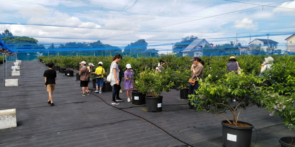 前日の豪雨から一転夏の空の農園に近隣の子供会の皆さまにご来園頂きブルーベリー食べ放題や井戸水汲み上げ体験をして頂きました。